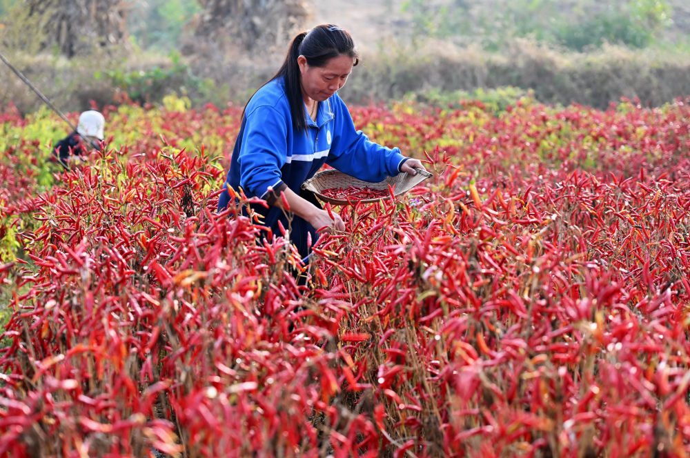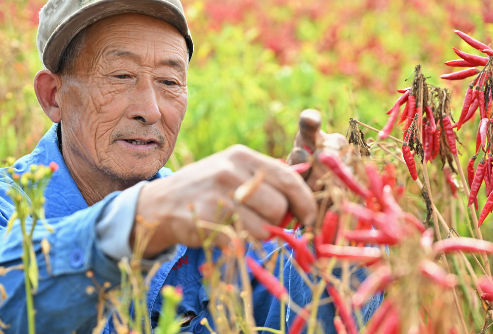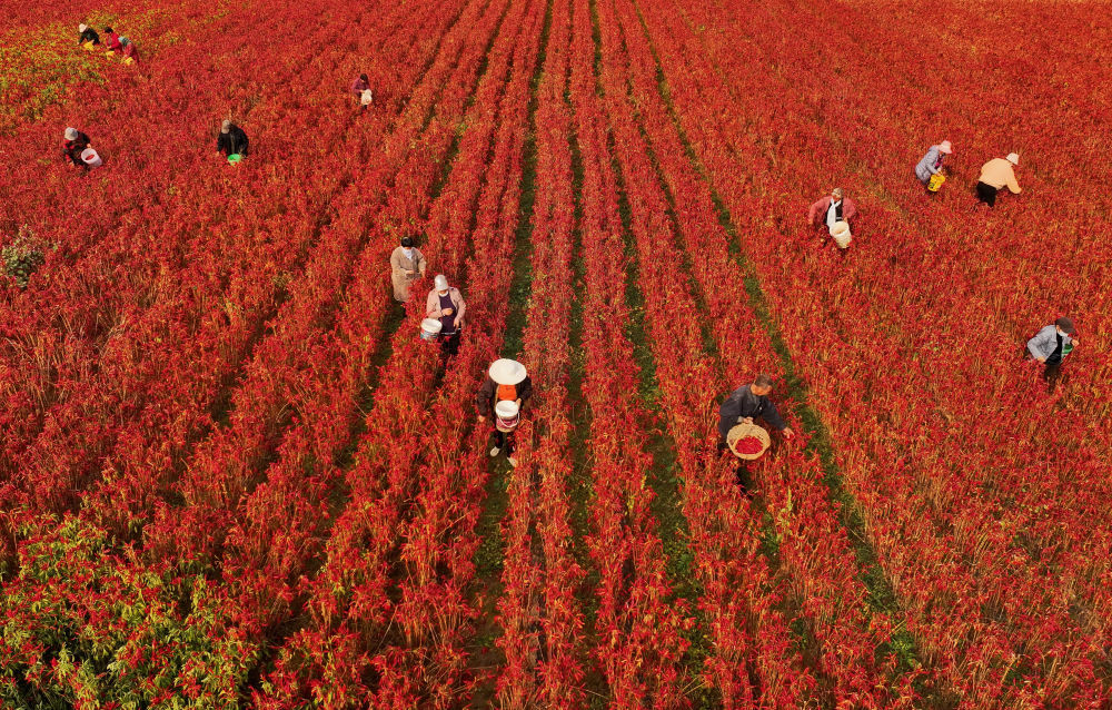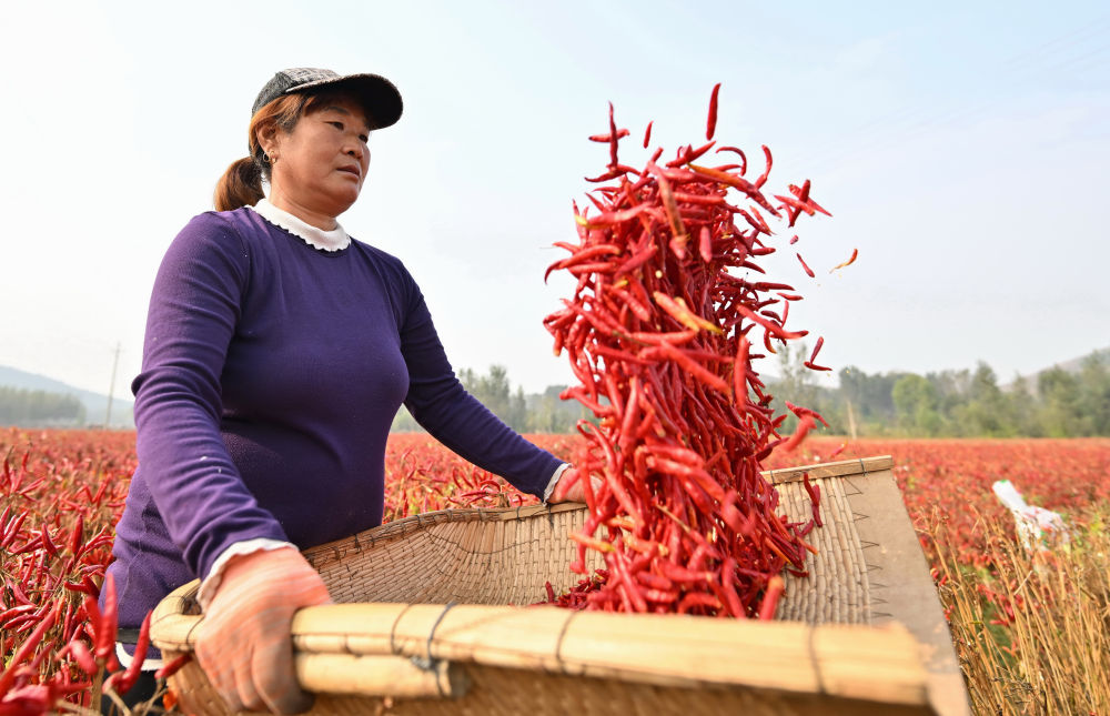 金秋时节,河北省滦州市油榨镇种植的朝天椒迎来收获季。近年来,河北省滦州市依托自身农业优势,结合市场需求,引导农民采取“合作社+农户”的模式因地制宜发展朝天椒种植,逐步形成集育苗、种植、销售于一体的辣椒产业链,有效促进农民增收。 新华社记者 杨世尧
