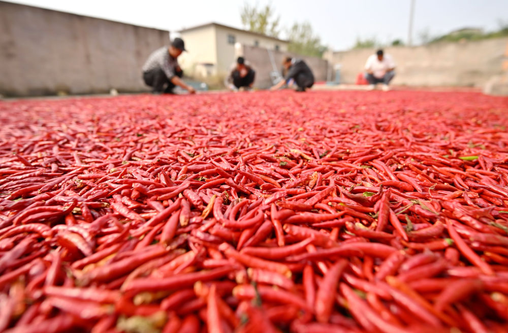 ↑10月14日,河北省滦州市油榨镇周寨子村一家辣椒种植合作社的社员在晾晒朝天椒。新华社记者 杨世尧 摄